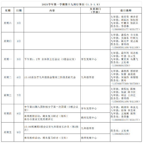 2025学年第一学期第十九周行事历(13-1.9) 作者: 发布时间:2026-01-05 浏览量: